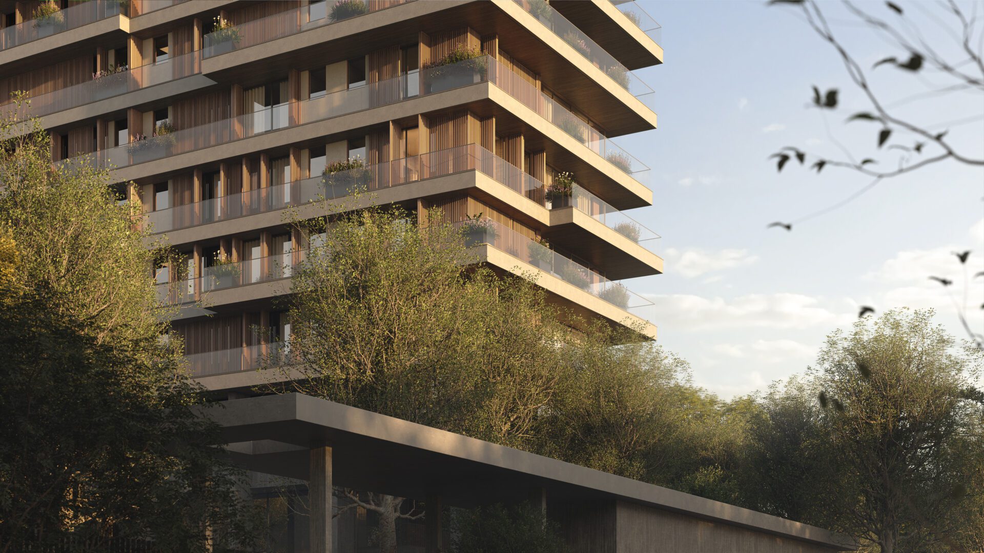 The façade strategy relies on the extensive use of balconies around the perimeter of the building. These elements, alternating between floors, generate a horizontal rhythm that brings movement to the architectural mass. Wooden-toned brise-soleils provide privacy and thermal comfort to the intimate areas of the units, while also establishing a chromatic dialogue with the natural surroundings. Vegetation placed in balcony planters completes the façade composition, strengthening the conversation between built and natural environments. Furthermore, this architectural gesture blurs the boundary between interior space and the forest landscape, allowing residents to feel part of the ecosystem.