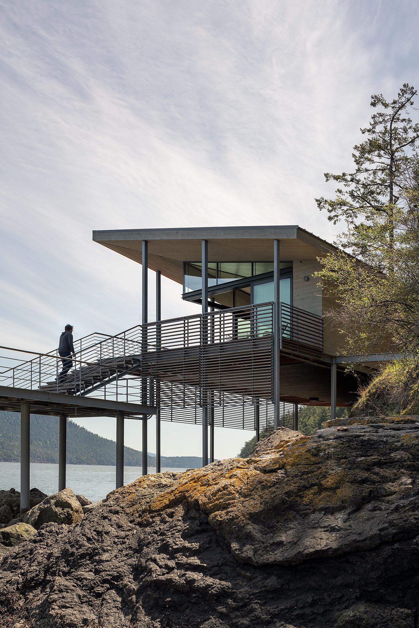Located in the San Juan Islands, the Boathouse stands foremost as a threshold between water and land, an idea it embraces literally by providing upland access to those arriving by boat or seaplane, and figuratively through its location and form. It straddles the elements, providing an entryway as well as a dramatic spot for a morning cup of coffee or a crab boil with the extended family.
