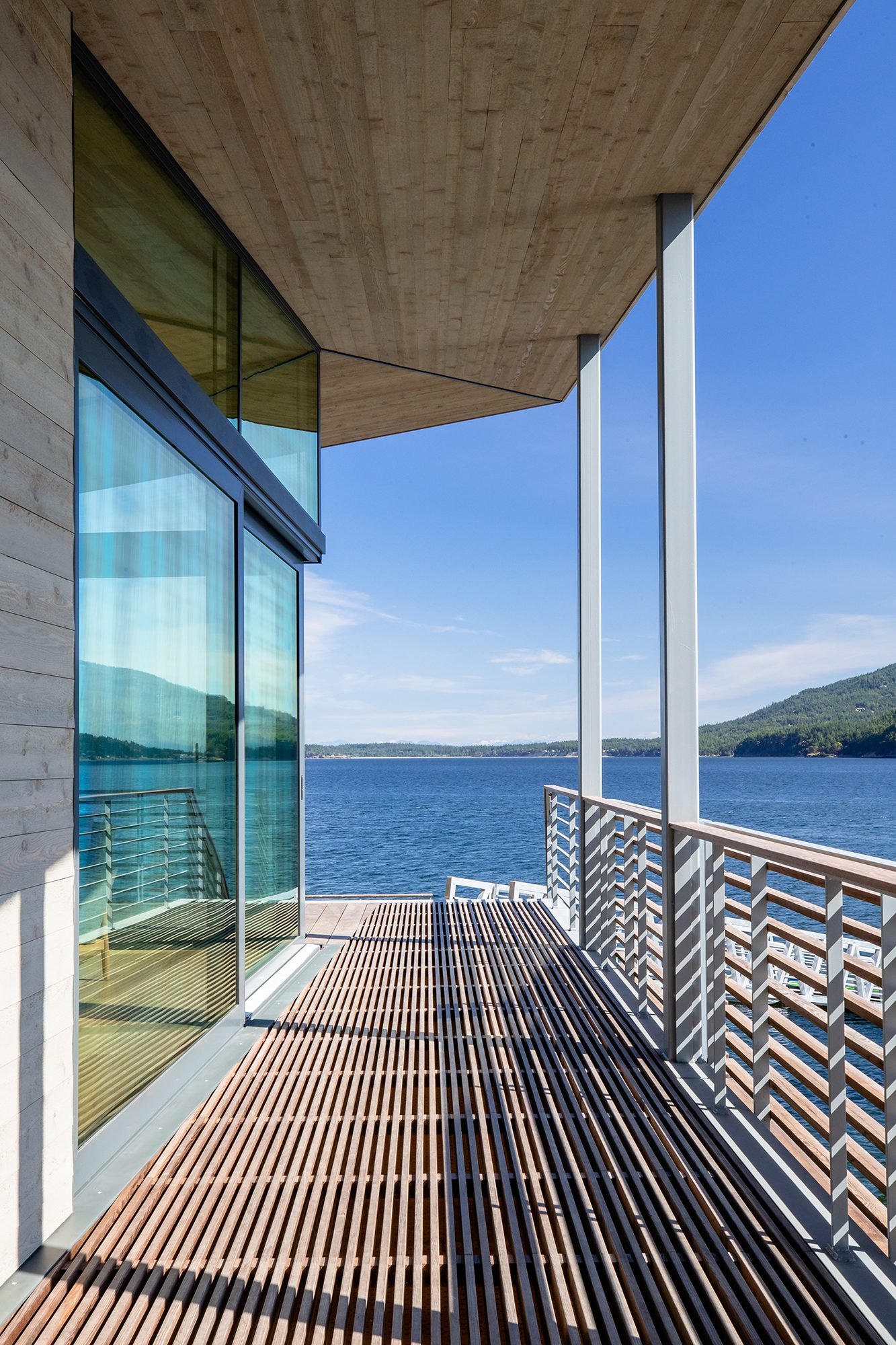 The language of the interior continues to the exterior, but with resilient materials able to weather the harsh environment: the smooth ash ceiling and floor transition to rough stained cedar and heat modified ash decking, while the refined clear cedar interior cladding carries into rough tight-knot exterior siding. The weathered wood railings extend down to blur the mass of the structure’s façade and provide privacy from passing boats.