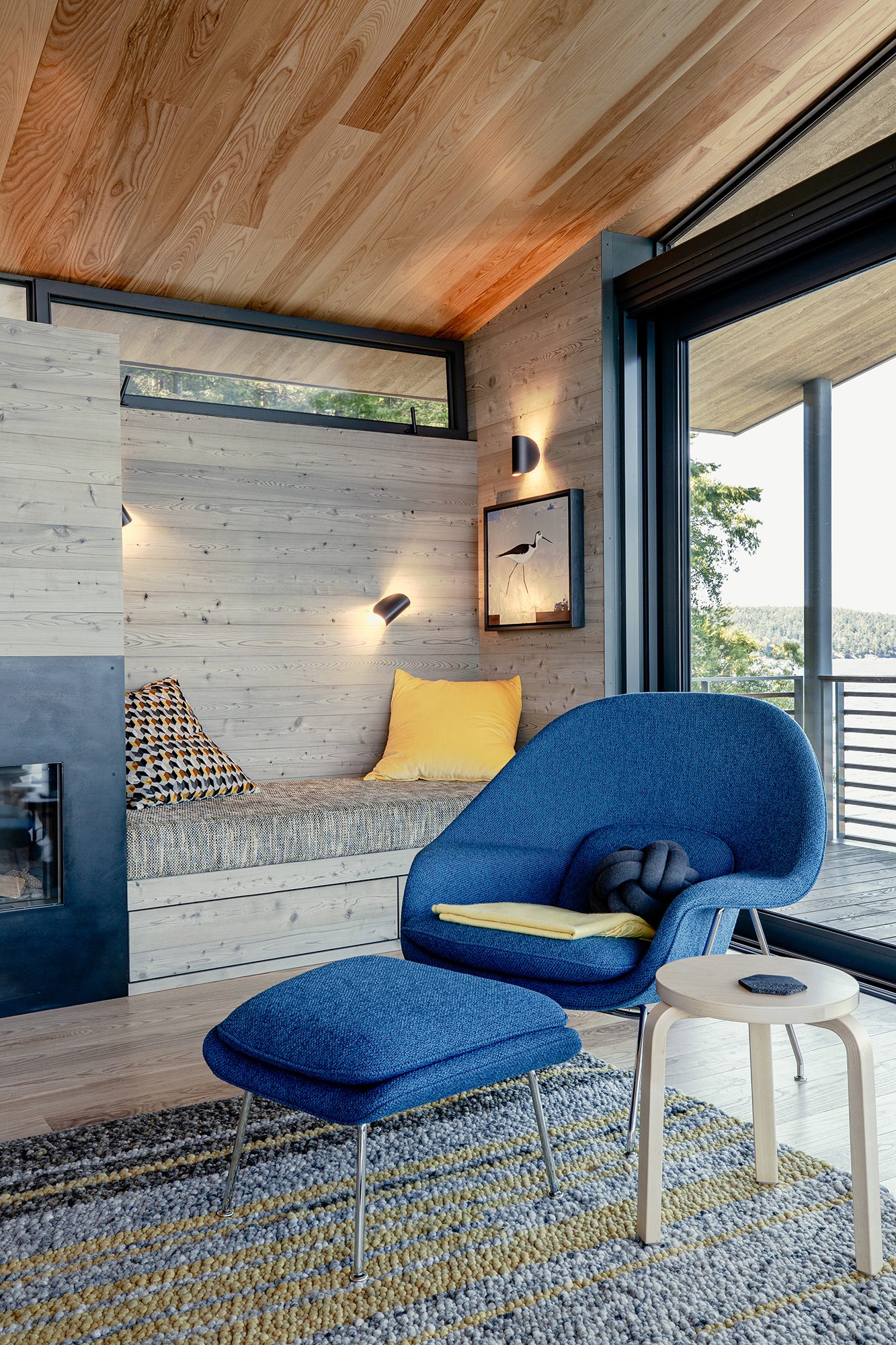 As one approaches the Boathouse from the land, it is barely visible through the trees; a dip in the topography together with the roof geometry serves to tuck the building into the landscape. Upon entry, the building opens dramatically to the Salish Sea. The ash ceiling draws a direct line to the view through glass walls and sliding glass corner doors. Services are tucked landward in a wood-clad volume, with windows strategically placed to highlight views of treetops and moss-covered stones. Steel accents notch into the wood volume to articulate the kitchen, fireplace, and shelving.
