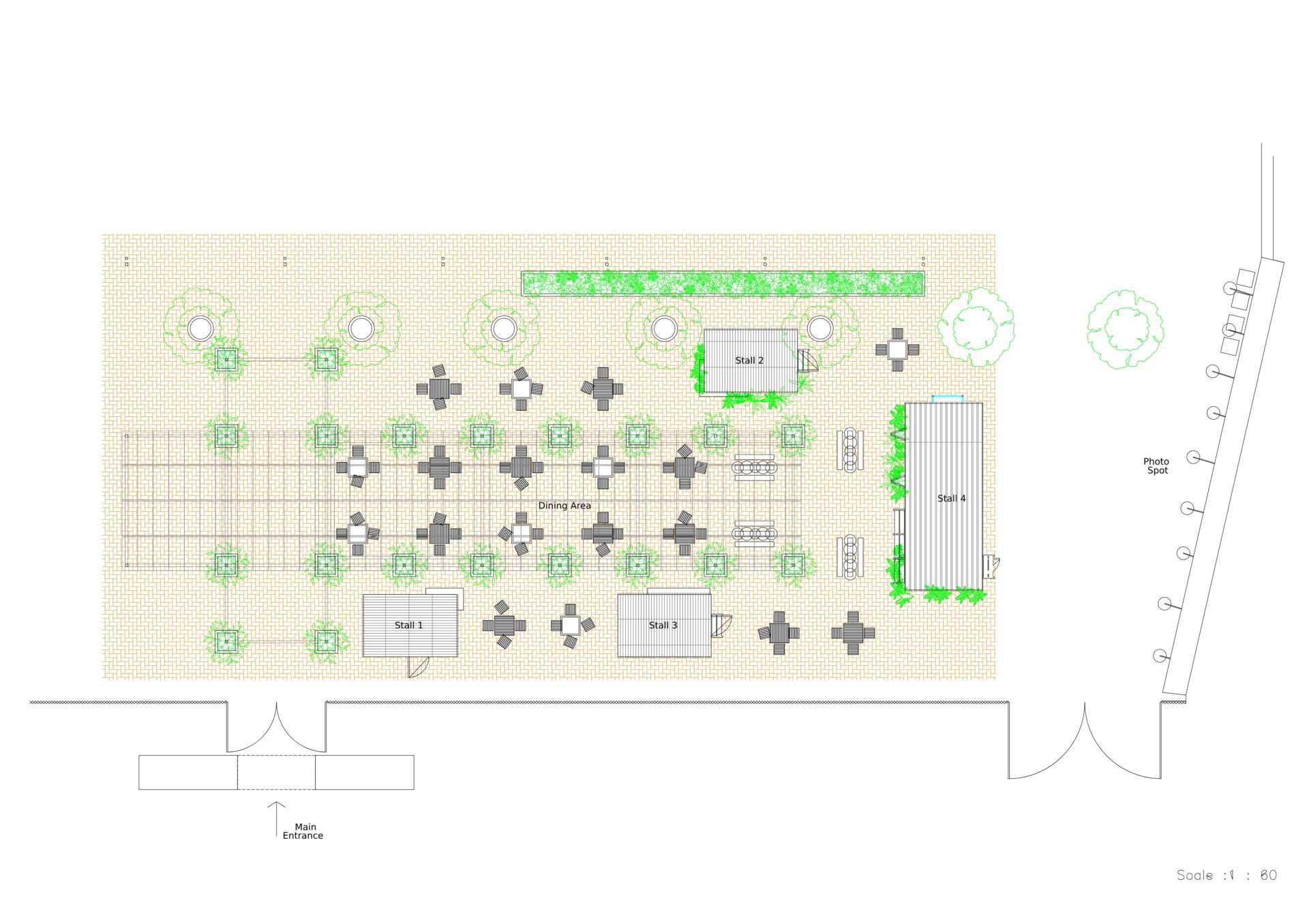The dining space includes four uniquely designed stalls and seating areas surrounded by greenery, improving air quality and enhancing the open-air atmosphere. Brightly colored tables and chairs made from recycled materials foster a cheerful and welcoming environment. Decorative elements such as reclaimed wood art, metal sculptures, and repurposed furniture add layers of visual and cultural depth, blending functionality with artistic expression.