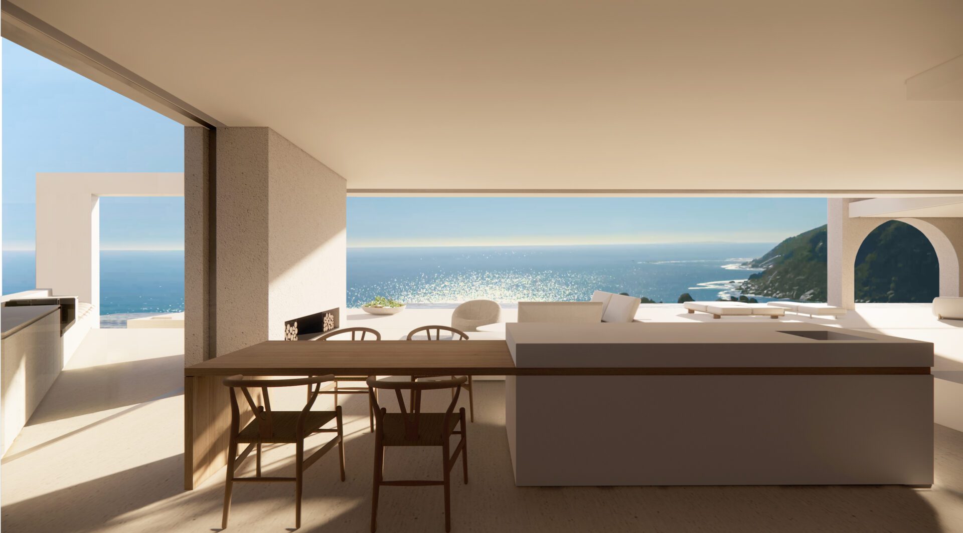 Material selection is inspired by the beach below, kept natural and worn; granite, white concrete, slate and limestone all feature in the soft design palette of Sunset Villa. Integrating granite rock excavated from the site into the lower level and basement wine cellar adds a touch of Mediterranean influence while grounding the design concept in the context of the natural coastal tapestry.